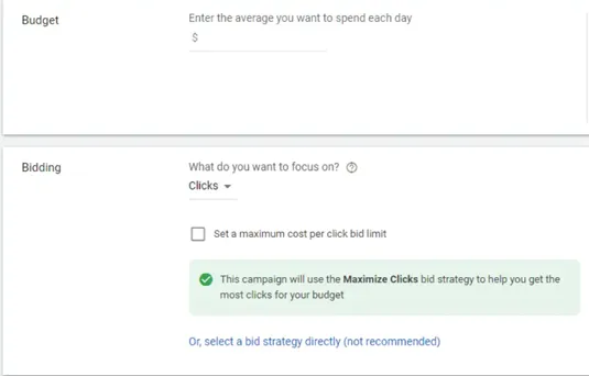 Once you’ve selected your target audience, it’s time to input budgetary constraints and bidding strategies. Google provides several bidding options based on your goals and allows you to determine how to achieve the most clicks. You can start off with default options here until you want to start experimenting with more advanced methods of bidding.