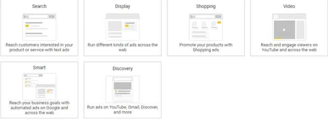 Similar to the goals, there are a total of six (6) campaign types, including but not limited to search, display, and video. Depending on what type of campaign you opt for, the steps that follow may vary slightly as certain campaign types can only be used with certain goals.