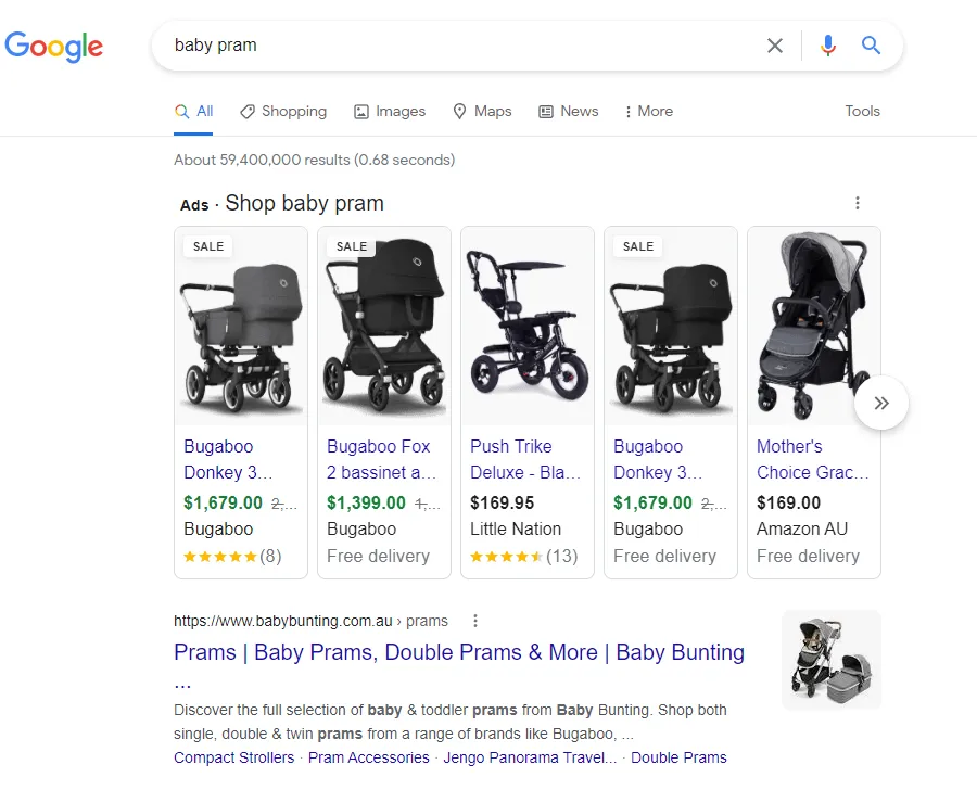 This type of ad is, evidently, a great choice for those looking to promote a product. Appearing on search results pages and Google Shopping pages, shopping ads is a great way to digitally showcase a product. Shopping ads appear above search ads (where applicable) and also in the "Shopping" tab on Google.